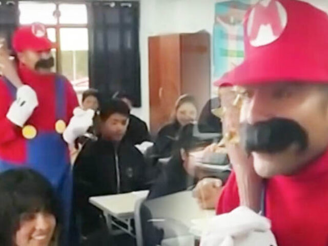 De esta manera el profesor de primaria Juan Quispe, se vistió del popular personaje de Nintendo, Mario Bros, lo que fue del agrado de sus estudiantes del Colegio particular Galileo en la ciudad imperial del Cusco.