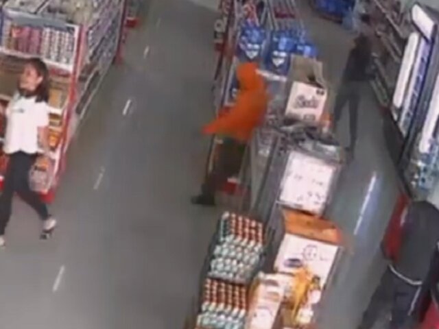Los sujetos solo se tomaron 40 segundos para asaltar un minimarket y robarse más de 2000 soles en ventas y celulares de los clientes y trabajadores.