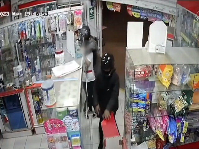 Las cámaras de seguridad de una farmacia de Huancayo captaron el momento exacto en el que dos delincuentes irrumpen en el establecimiento para apoderarse de las ganancias del día.