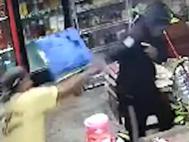 Sin embargo, un hombre que atiende en el lugar, que con total indiferencia se acerca al ladrón armado y pese a que este lo intenta golpear con la cacha de la pistola, lo enfrentó.