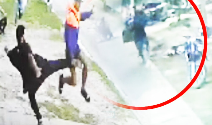 Sin embargo, uno de los trabajadores se percató y salió corriendo atrás del ladrón. Lo persiguió unos metros y al tenerlo cerca, calculó y en cuestión de segundos le lanza una patada voladora, provocando que el ladrón caiga de caras dejando la mesa.