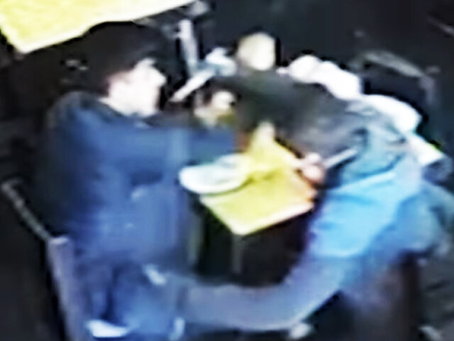 Las cámaras del negocio captaron cuando un sujeto se acercó a la mesa de la víctima, entabla una breve conversación, se siente junto a él y, en cuestión de segundos, toma un cuchillo y lanza un ataque sorpresivo.