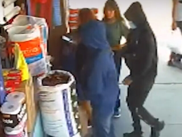 Mientras dos de los ladrones ingresa al negocio, su cómplice se quedó en los exteriores amedrentando a sus víctimas con una pistola y vigilando que nadie se acerque.