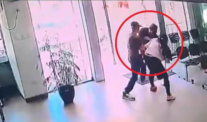 Cámaras de seguridad captaron el preciso momento en que la mujer entró junto a su hijo a la notaría tras ser perseguidos por los 'marcas'. Uno de los delincuentes bajó de la motocicleta e ingresó para atacar a la mujer.