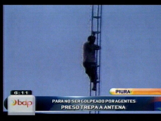 Por más de tres horas, un interno de una cárcel de Piura permaneció en lo alto de una antena de comunicación al escapar de los agentes policiales. El preso no bajó hasta la llegada de la prensa y autoridades del Ministerio Público. Buenos Días Perú.