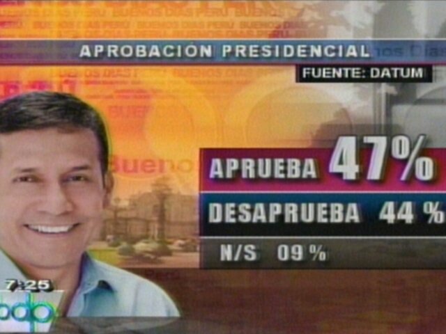 Según una última encuesta nacional de Datum, la gestión del jefe de Estado es respaldada por el 47% de la población y el 44% la desaprueba. En relación al mes anterior, Humala subió dos puntos porcentuales en su popularidad.