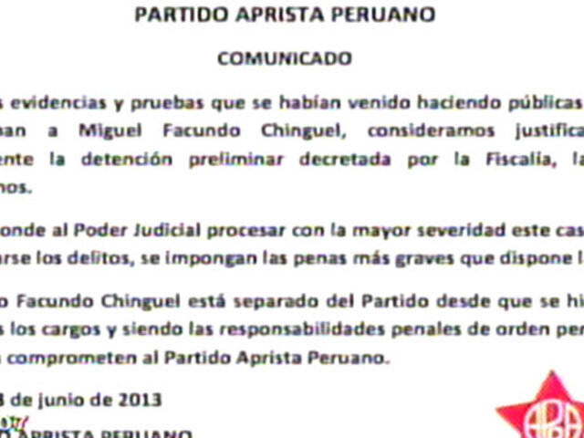 A unas horas de la detención del ex presidente de la Comisión de Gracias Presidenciales del segundo gobierno aprista, el partido se pronunció manifestando que consideran justificada la decisión.