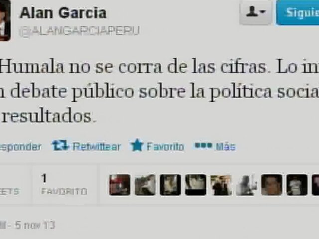 Tras las últimas declaraciones del jefe de Estado Ollanta Humala, en las que calificaba de "poco ético" que la exprimera dama, Pilar Nores, haya trabajado algunos programas sociales a través de su ONG, el líder aprista defendió lo expuesto por su todavía esposa acerca de la inclusión durante su gobierno y le pidió a Humala que "conteste las cifras y sin grosería". Además, esta mañana, Alan García, escribió a través de su cuenta en Twitter que no se corra de las cifras y lo invitó a un debate público sobre la política social de su gobierno y el análisis de sus resultados.