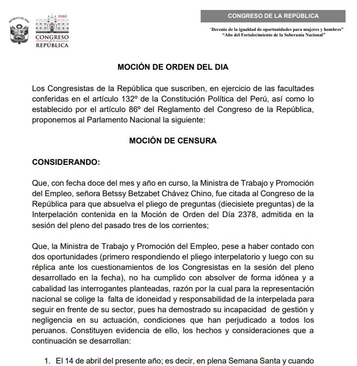 La bancada de Fuerza Popular presentó hoy una moción de censura contra la ministra de Trabajo y Promoción del Empleo, Betssy Chávez, por aprobar la huelga de controladores aéreos en feriados días de Semana Santa, lo que generó que miles de personas perdieran sus vuelos.