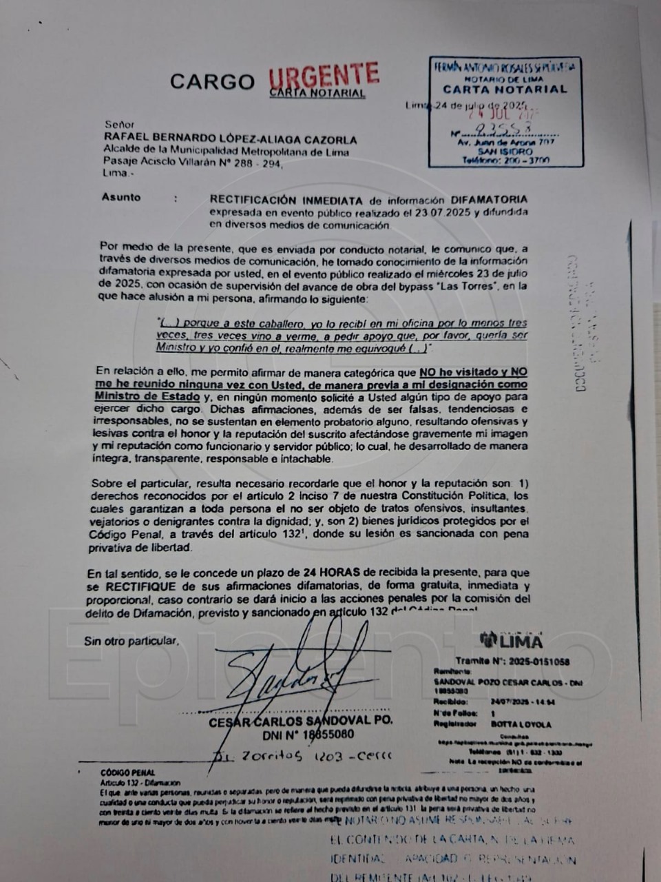 El ministro de Transportes y Comunicaciones, César Sandoval, ha enviado una carta notarial al alcalde de Lima, Rafael López Aliaga, demandando una rectificación inmediata por acusaciones que tilda de falsas y difamatorias. “Nunca previo a ser ministro de Estado me reuní con el señor López Aliaga”, afirmó con contundencia durante una reciente conferencia de prensa. Sandoval advirtió que, de no haber rectificación en un plazo de 24 horas, procederá judicialmente por calumnia.