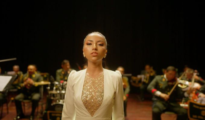 Con nuevos arreglos, la baladista iquiteña grabó su exitosa canción “Luchadora” junto a la Orquesta Internacional de la PNP.