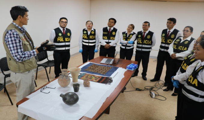La jornada continuó con un taller práctico de identificación de bienes culturales, que instruyó a los participantes en la detección de algunos tipos de piezas –ceramios, textiles, pinturas virreinales, entre otros, que suelen ser objeto de tráfico ilícito, mediante diversas modalidades.