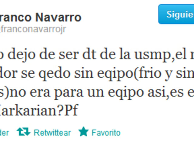 En las últimas horas de la noche del sábado un mensaje en la red social Twitter enviada por Franco Navarro (hijo), señaló que el ex seleccionado peruano dejó la USMP.