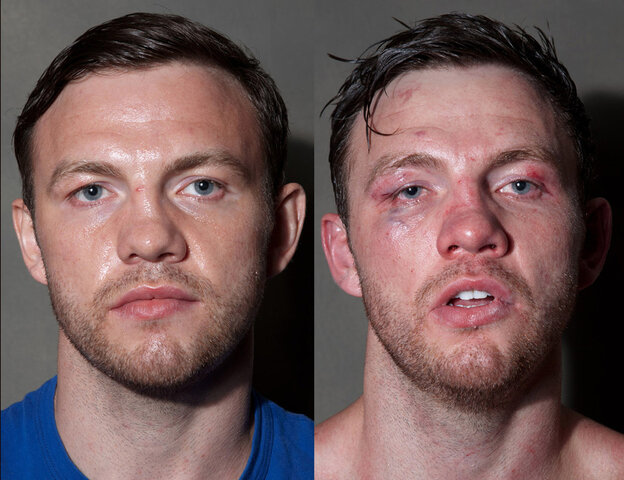 El fotógrafo estadounidense Howard Schatz decidió retratar a conocidos boxeadores durante seis meses al inicio y al final de cada pelea, obteniendo estremecedores fotos. At the Fights: Inside the World of Professional Boxing es un libro que retrata a estos deportistas antes y después de pasar por el ring. En las imágenes se pueden ver que la cara y el cráneo son las regiones más afectadas por los golpes. Según médicos, los lóbulos frontales del cerebro son los que más sufren durante los duelos, porque los golpes que van a la frente hacen que las crestas esfenoides retrocedan, provocando desgarres y hemorragias, y cuando éstas son intensas pueden provocar la muerte. A continuación vea las fotografías más impresionantes.