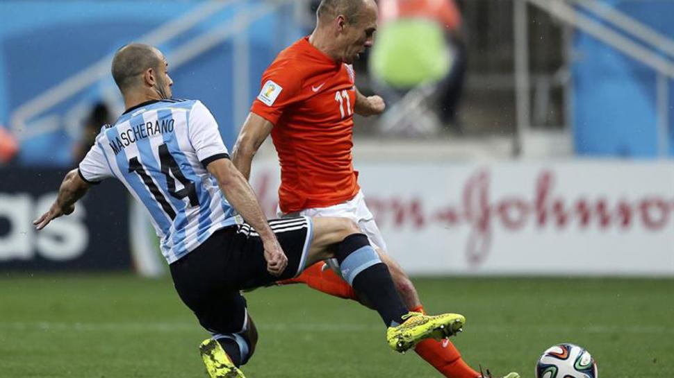 Robben desbordó por la izquierda con peligrosidad, pero ahí estaba Mascherano, leyendo la jugada para estirarse al límite e interceptar el disparo del holandés que tenía destino de gol. Evitó el tanto y así la eliminación de su equipo de la Copa del Mundo.