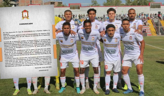 Por el todo o nada. Ayacucho FC sigue firme en su postura de mantenerse en primera división y mediante un comunicado anunciaron que presentaron un recurso de apelación ante el Tribunal Arbitral del Deporte (TAS) para recuperar la categoría y que sea el club Sport Boys el que le deje su lugar en la Liga 1.