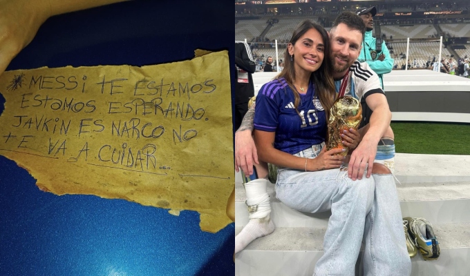 “Messi, te estamos esperando. Javkin también es narco, no te va a cuidar”, dice el texto escrito con birome, en referencia también al intendente rosarino.