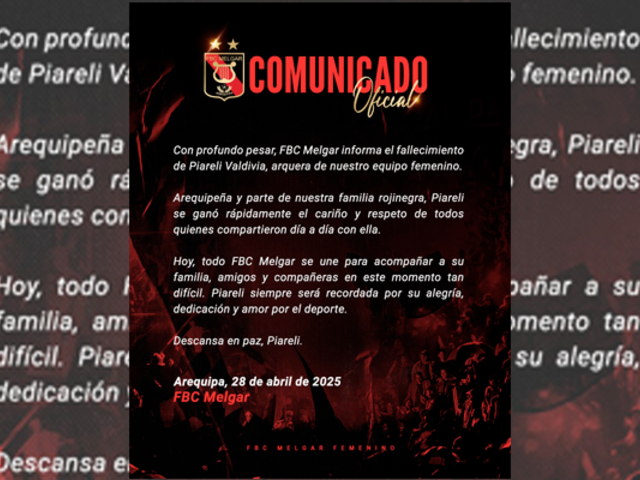 A través de las redes sociales oficiales del Fútbol Club Melgar de Arequipa: "Con profundo pesar, FBC Melgar informa el fallecimiento de Piareli Valdivia, arquera de nuestro equipo femenino", se lee en el comunicado publicado por la institución arequipeña.