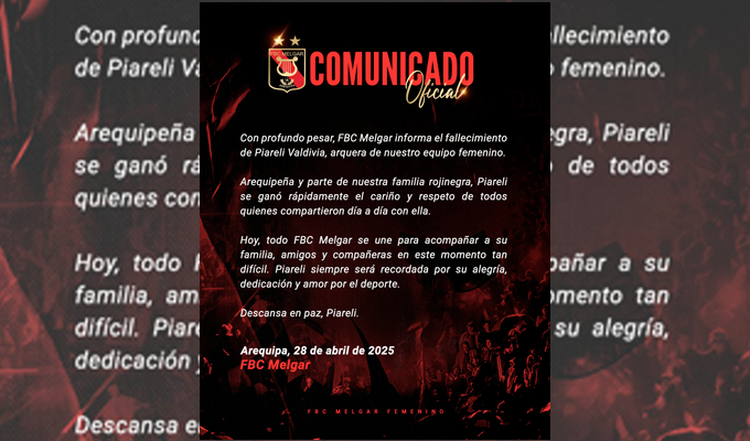 A través de las redes sociales oficiales del Fútbol Club Melgar de Arequipa: "Con profundo pesar, FBC Melgar informa el fallecimiento de Piareli Valdivia, arquera de nuestro equipo femenino", se lee en el comunicado publicado por la institución arequipeña.