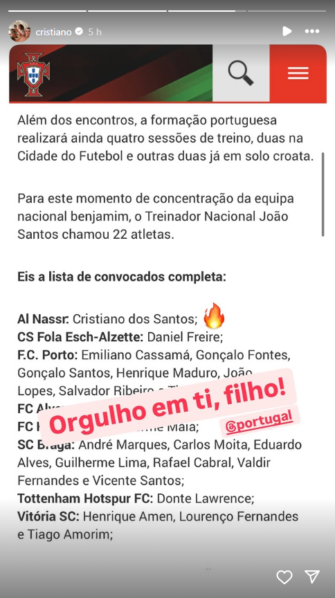 El heredero del mejor jugador portugués de la historia, ha sido incluido por la Federación Portuguesa de Fútbol en la lista que competirá en el torneo internacional Vlatko Markovic, a disputarse del 13 al 18 de mayo en Croacia. Este certamen reunirá a varias promesas del fútbol europeo, y será una vitrina importante para el hijo del astro portugués. La convocatoria fue recibida con entusiasmo tanto por el joven jugador como por los fanáticos que siguen de cerca la carrera del heredero de 'CR7'.