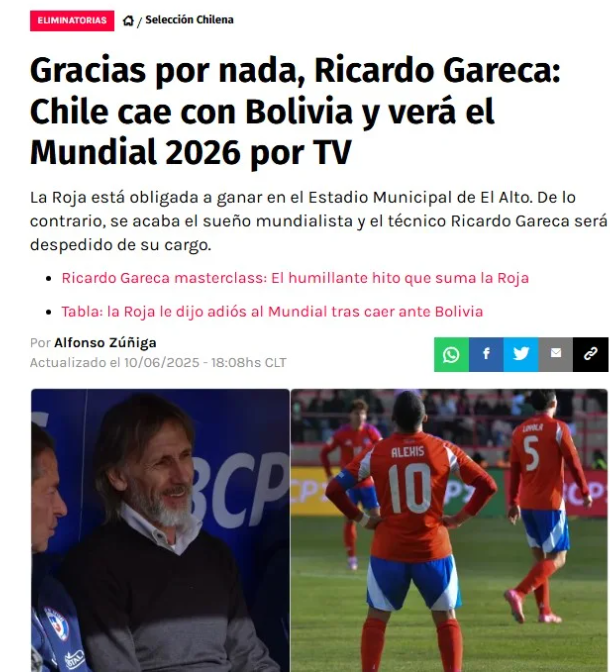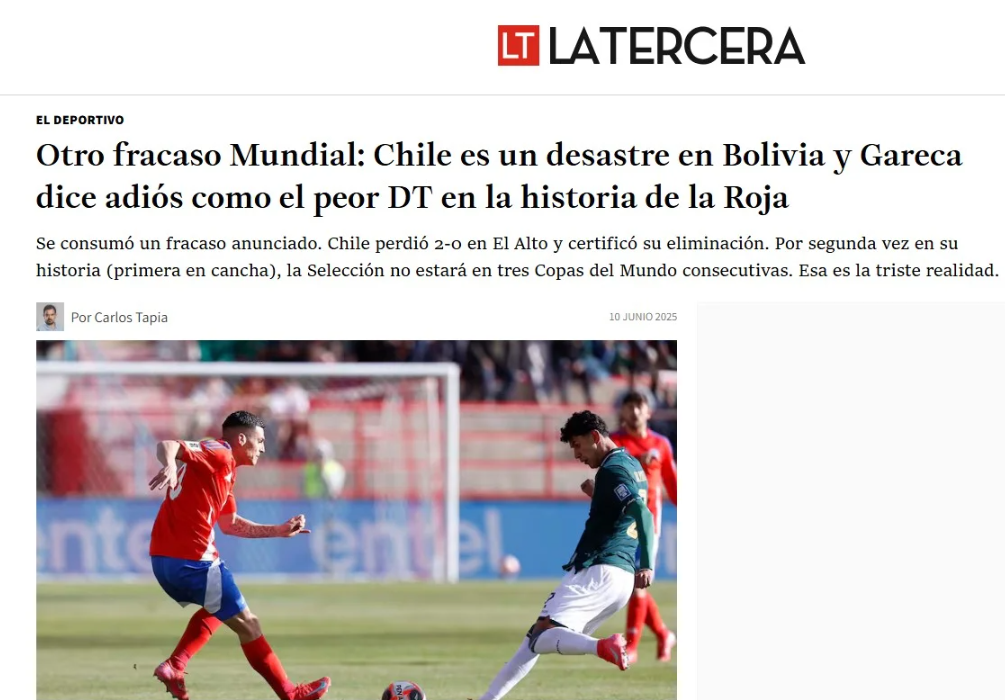 La selección chilena de fútbol sufrió un duro golpe tras caer 2-1 ante Bolivia en El Alto, resultado que selló su eliminación de las Eliminatorias Sudamericanas rumbo al Mundial 2026. Este revés, sumado a la reciente derrota por 1-0 frente a Argentina, desató una tormenta de críticas contra el entrenador Ricardo Gareca, quien no ha logrado revertir el mal momento de la Roja. La prensa chilena ha sido implacable, calificando su gestión como un fracaso histórico. “La peor Roja de la historia da pena ante Bolivia”, sentenció el medio RedGol, reflejando el sentir de una afición desencantada con el desempeño del equipo.