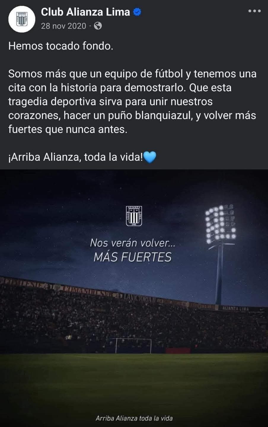 “Hemos tocado fondo. Somos más que un equipo de fútbol y tenemos una cita con la historia para demostrarlo. Que esta tragedia deportiva sirva para unir nuestros corazones, hacer un puño blanquiazul, y volver más fuertes que nunca antes. ¡Arriba Alianza, toda la vida! Nos verán volver”, postearon desde la institución grone.