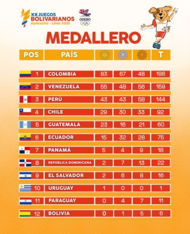 En tanto, Venezuela permanece en el segundo puesto con 158 medallas, de las cuales 55 son de oro, aunque con un Perú cada vez más cerca en el acumulado. Más atrás se mantienen Chile, con 92 medallas, y Guatemala, que sigue siendo el país invitado con mejor rendimiento en esta edición al sumar 60 preseas y escalar posiciones en el tablero general.