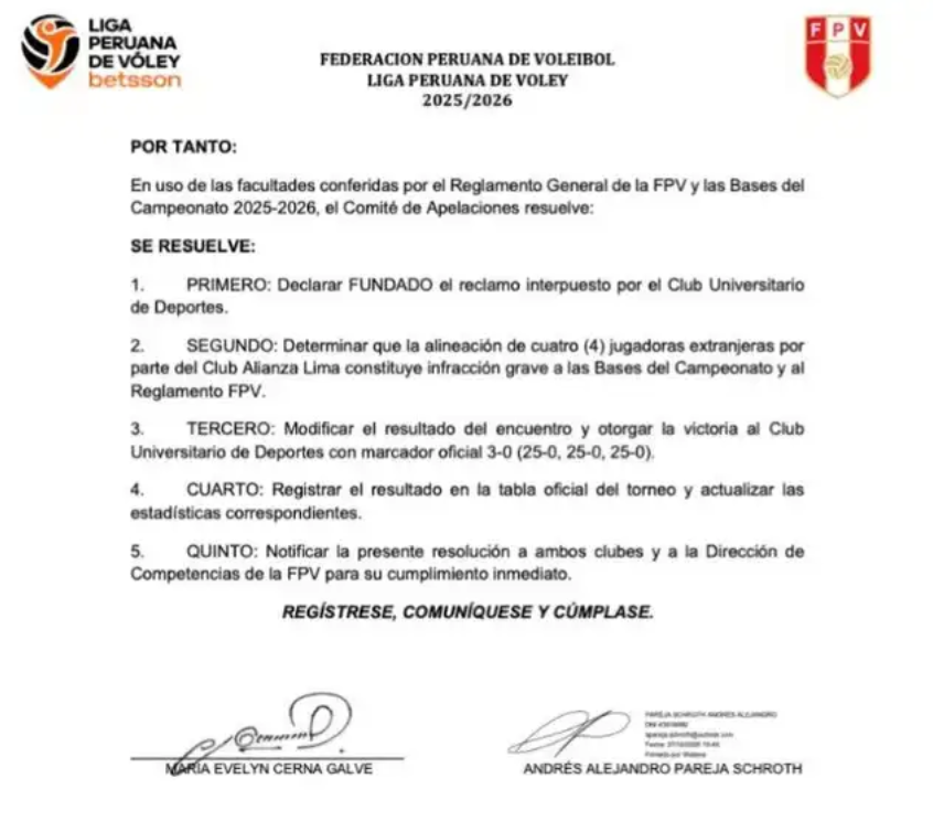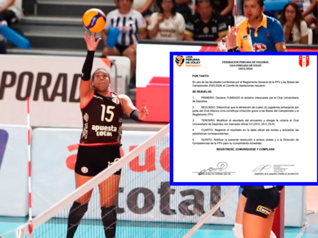 Universitario de Deportes fue declarado ganador del clásico ante Alianza Lima en la Liga Peruana de Vóley 2025/2026, luego de que el Comité de Apelaciones de la Federación Peruana de Voleibol resolviera a su favor un reclamo por alineación indebida. En la resolución oficial se señala que se debe “declarar FUNDADO el reclamo interpuesto por el Club Universitario de Deportes”, decisión que cambia por completo el desenlace deportivo del encuentro disputado el último domingo.