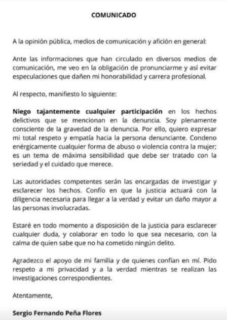 En el documento, Sergio Peña negó de manera tajante cualquier participación en los hechos delictivos mencionados en la denuncia, y aseguró ser consciente de la gravedad del caso. Asimismo, expresó su respeto y empatía hacia la persona denunciante.