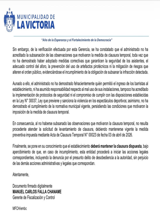 El municipio de La Victoria decidió mantener la clausura temporal del estadio de Matute pese a la medida cautelar presentada por Alianza Lima. Mediante una carta, la comuna rechazó el pedido y mantuvo la medida tomada tras la muerte de un hincha durante el banderazo del viernes 3 de abril.