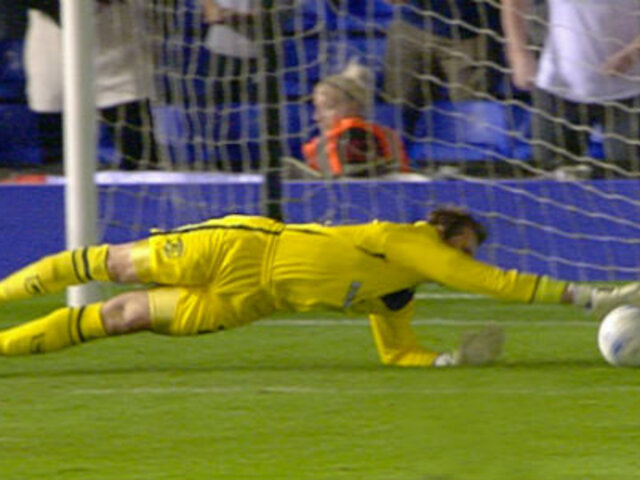 El arquero del Birmingham sacó una mano milagrosa para evitar un gol casi seguro.