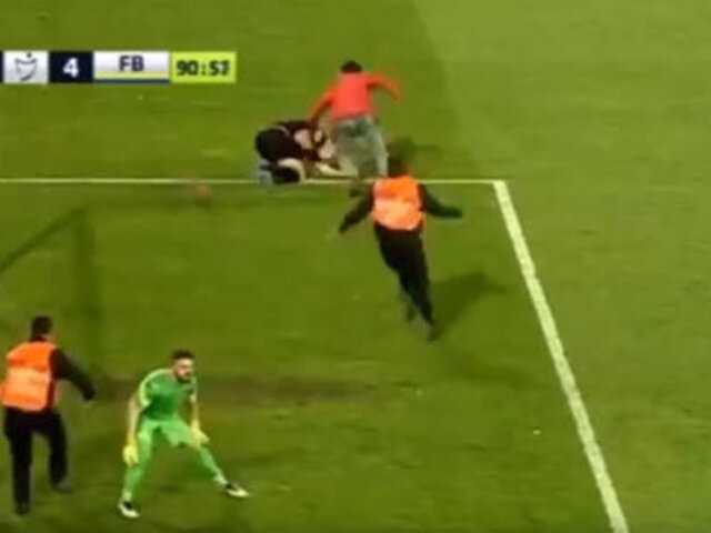 Sorpresivamente, un aficionado entró a la cancha y atacó por la espalda al juez de área, quien luego de caer al césped recibió una patada y varios golpes por parte del furioso hincha.