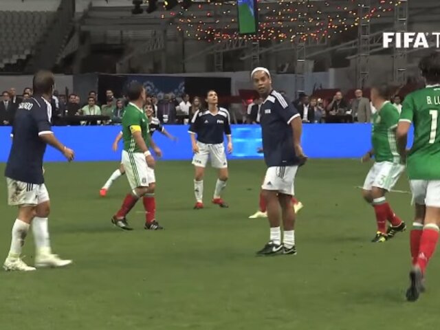 Corrían los 20 minutos del encuentro ante los máster del combinado mexicano, cuando 'Dinho' recepcionó un pase del histórico Raúl González. Lejos de parar el balón y encarar a los rivales, el ex Barcelona la tocó en una, dando la vuelta para confundir a sus oponentes.