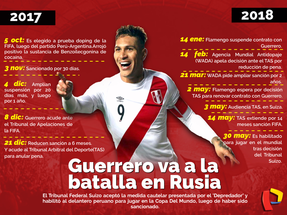 Tras una larga agonía, que empezó el 5 de octubre de 2017, al ser elegido para una evaluación antidopaje de la FIFA y la cual resultó positivo en su organismo la sustancia de Benzoilecgonina de cocaína, el capitán de la Selección Peruana, Paolo Guerrero, sí podrá cumplir el sueño de jugar en el Mundial de Fútbol que se celebrará en Rusia, a partir del 14 de junio.
