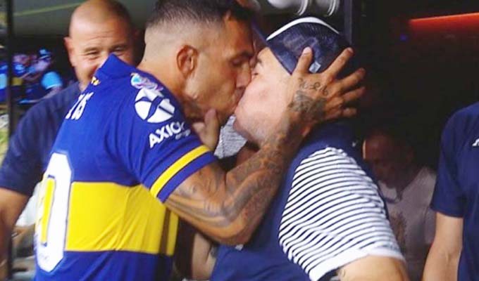 En el fútbol argentino, antes del inició al choque entre Boca Juniors vs. Gimnasia, el delantero xeneize Carlos Tévez y Diego Maradona se saludaron y dieron un beso en los labios en el banquillo del exfutbolista y campeón del mundo y ahora técnico de Gimnasia y Esgrima de la Plata.
