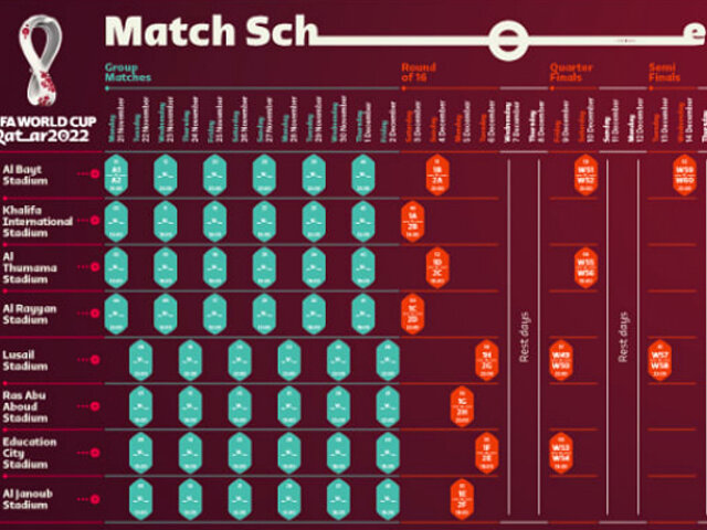 Ya es oficial. La Federación Internacional de Fútbol Asociado (FIFA) presentó el calendario del Mundial Qatar 2022, el cual empezará el 21 de noviembre y terminará el 18 de diciembre.