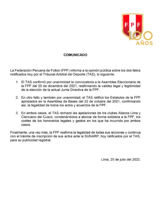 De acuerdo con el comunicado que presentó la FPF, señala que, “El TAS confirmó por unanimidad la convocatoria a la Asamblea Eleccionaria de la FPF el 20 de diciembre del 2021, reafirmando la validez legal y legitimidad de la elección de la actual Junta Directiva,”. En el mismo sentido, el órgano internacional “ratificó los Estatutos de la FPF aprobados en la Asamblea de Bases el 22 de octubre del 2021″.