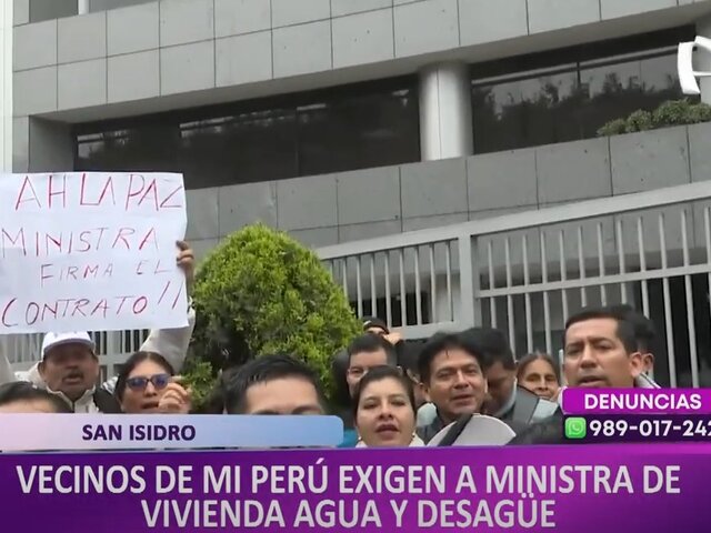 Decenas de pobladores del distrito de Mi Perú se congregaron frente al Ministerio de Vivienda en San Isidro para exigir la implementación de obras de saneamiento de agua y desagüe.