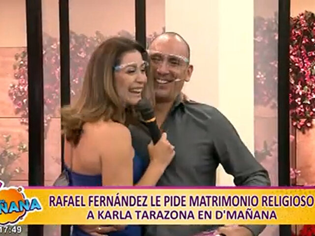 No se lo esperaba. Karla Tarazona se emocionó con la sorpresiva pedida de matrimonio religioso de su pareja Rafael Fernández para su cumpleaños. La conductora y modelo no se esperaba la propuesta en medio del set de D’Mañana, bajo la conducción de Adriana Quevedo.