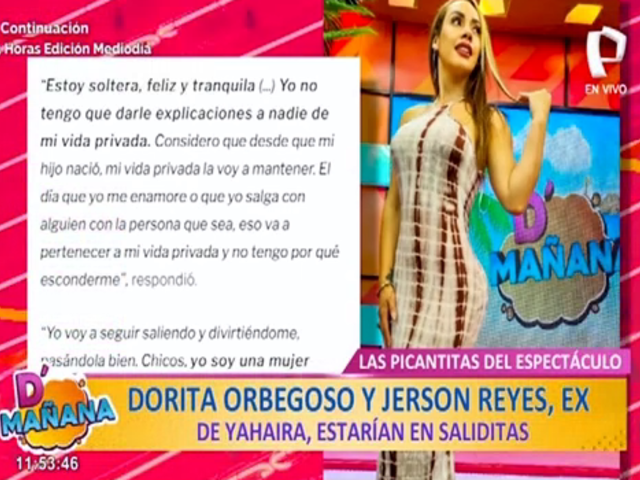 "Estoy soltera, feliz y tranquila (...) Yo no tengo que darle explicaciones a nadie de mi vida privada. Considero que desde que mi hijo nació, mi vida privada la voy a mantener. El día que yo me enamore o que yo salga con alguien con la persona que sea, eso va a pertenecer a mi vida privada y no tengo por qué esconderme", respondió.