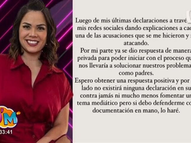 “Luego de mis últimas declaraciones a través de mis redes sociales dando explicaciones a cada una de las acusaciones que se me hicieron y no ataco. Por mi parte, ya se dio respuesta de manera privada para poder iniciar con el proceso que nos llevararía a solucionar nuestros problemas como padres”, expresó a través de sus historias de Instagram.