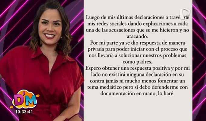 “Luego de mis últimas declaraciones a través de mis redes sociales dando explicaciones a cada una de las acusaciones que se me hicieron y no ataco. Por mi parte, ya se dio respuesta de manera privada para poder iniciar con el proceso que nos llevararía a solucionar nuestros problemas como padres”, expresó a través de sus historias de Instagram.