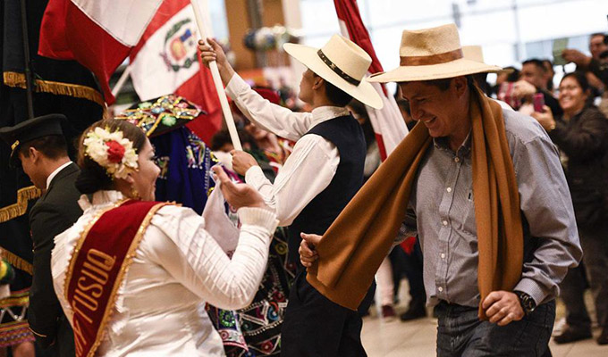 Los bailarines vistiendo trajes típicos de marinera, huayno y pandillas de la selva, presentaron alegres coreografías. El vistoso recibimiento arrancó sonrisas y aplausos de los turistas presentes en el aeropuerto Jorge Chávez.