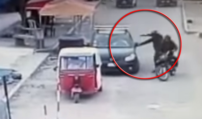 Las imágenes captadas por una cámara de seguridad muestran como el auto se detiene en medio del tráfico e inmediatamente entran en escena dos sujetos en una motocicleta.