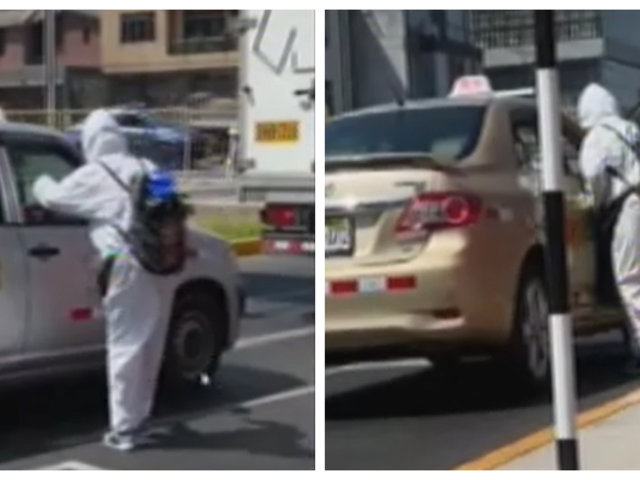 Un video grabado en una red social da cuenta el preciso momento en que un hombre que utiliza un traje de seguridad, mascarillas y guantes, de dedica a la desinfección de autos que se estacionan esperando el cambio de luz.