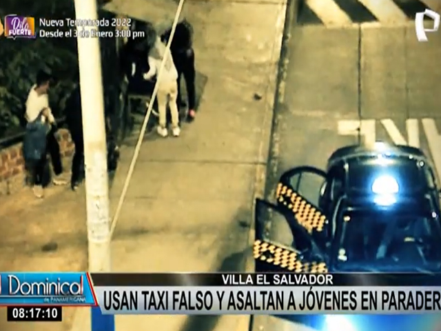 Cámaras captaron el momento en un grupo de jóvenes esperaba un vehículo de transporte en el paradero cuando de pronto aparece un auto y sus características de taxi hace que no sospechen que se trata de una banda delincuencial. De pronto, bajan tres hombres armados y con amenazas le quitan sus pertenencias a las víctimas.