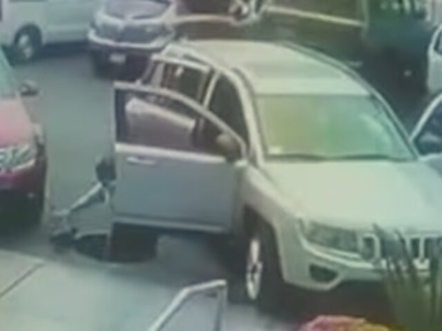 El video muestra cuando la llegada de una camioneta de la cual descienden los propietarios de uno de los inmuebles del edificio. Al estacionar, la anciana cae por el buzón ubicado frente al condominio.