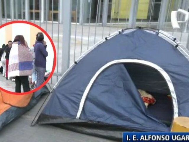 Desde el día de ayer, decenas de padres de familia se han instalado a las afueras del colegio Alfonso Ugarte, en el distrito de San Isidro, con el objetivo de asegurar una vacante para el próximo año escolar. Algunos llegaron con carpas, colchones inflables y cobertores para soportar la fría noche y las lluvias que se registraron en la madrugada.