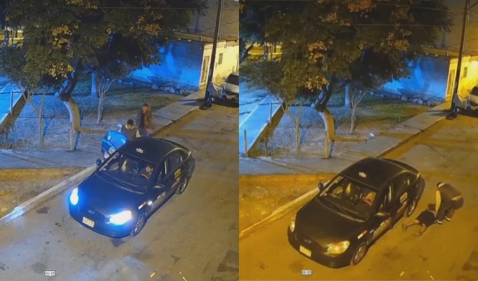 En imágenes se observa que uno de ellos aborda la unidad en la parte posterior y otro se sube en el asiento de copiloto. El hombre al volante avanza apenas unos metros cuando es amenazado con pistola en mano por los delincuentes.