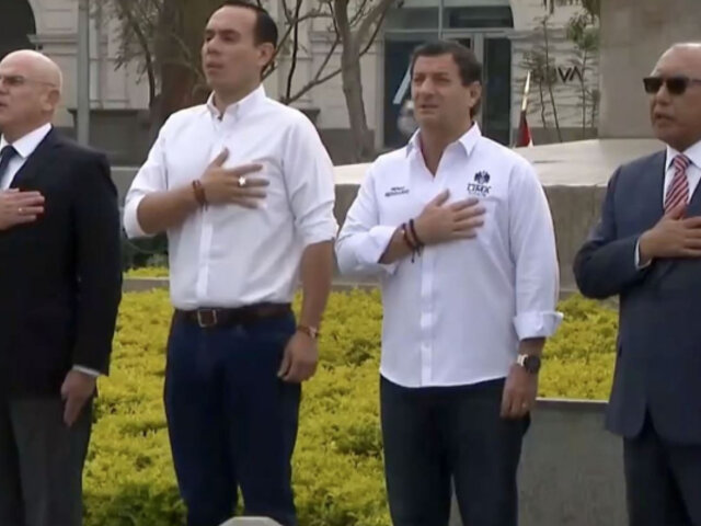 El presidente interino de la República, José Jerí, participa la mañana de este domingo 16 de noviembre, en una ceremonia de izamiento de la bandera en la Plaza San Martín, en el Cercado de Lima.